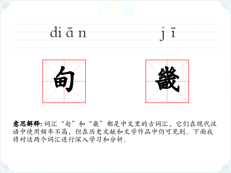 词汇“甸”和“畿”都是中文里的古词汇,它们在现代汉语中使用频率不高,但在历史文献和文学作品中仍可见到。下面我将对这两个词汇进行深入学习和分析。
