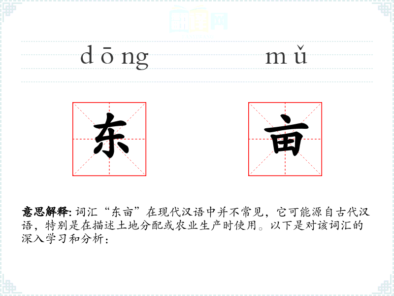 词汇“东亩”在现代汉语中并不常见,它可能源自古代汉语,特别是在描述土地分配或农业生产时使用。以下是对该词汇的深入学*和分析: