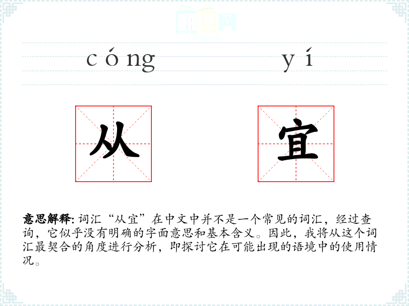 由于“从宜”不是一个标准词汇,我们可能需要从字面组合来推测其可能的含义。字面上看,“从”可以表示跟随、依照,而“宜”则表示适宜、合适。因此,“从宜”可能意味着按照适宜的方式或标准行事。
