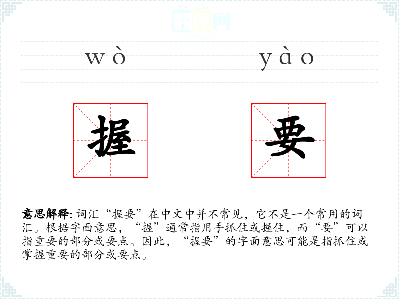 词汇“握要”在中文中并不常见,它不是一个常用的词汇。根据字面意思,“握”通常指用手抓住或握住,而“要”可以指重要的部分或要点。因此,“握要”的字面意思可能是指抓住或掌握重要的部分或要点。