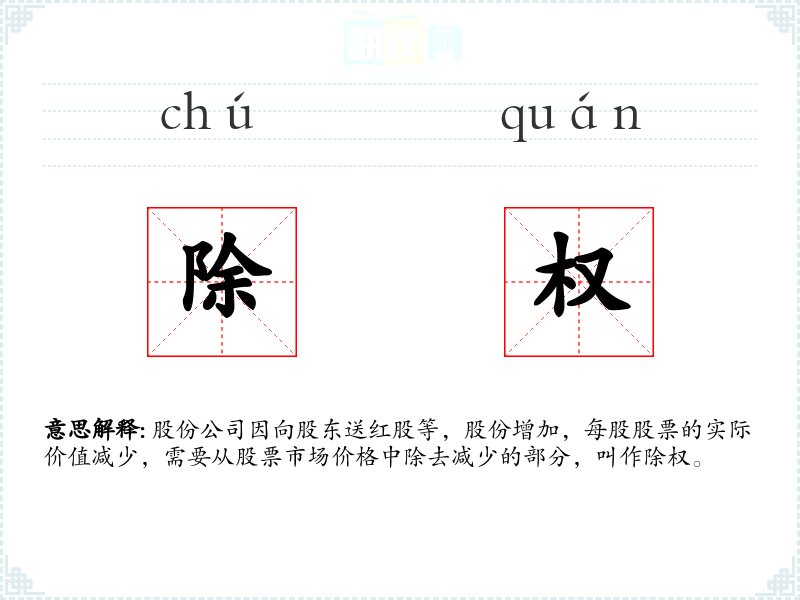 股份公司因向股东送红股等,股份增加,每股股票的实际价值减少,需要从股票市场价格中除去减少的部分,叫作除权。