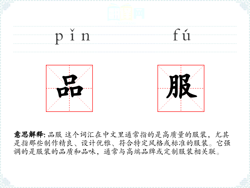 品服 这个词汇在中文里通常指的是高质量的服装,尤其是指那些制作精良、设计优雅、符合特定风格或标准的服装。它强调的是服装的品质和品味,通常与高端品牌或定制服装相关联。
