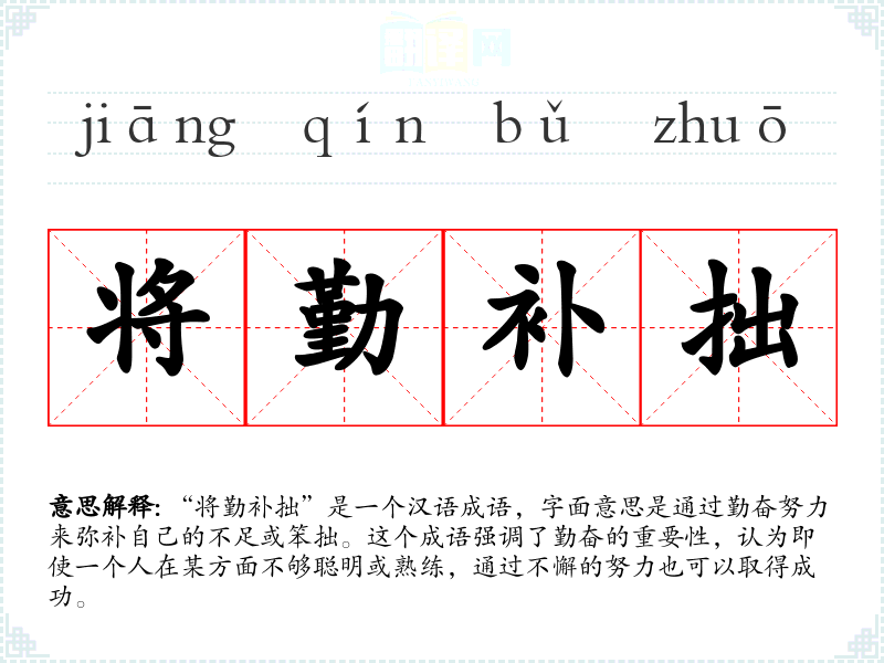 “将勤补拙”是一个汉语成语,字面意思是通过勤奋努力来弥补自己的不足或笨拙。这个成语强调了勤奋的重要性,认为即使一个人在某方面不够聪明或熟练,通过不懈的努力也可以取得成功。
