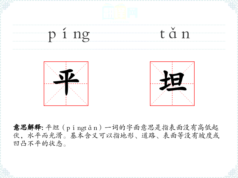 平坦(píngtǎn)一词的字面意思是指表面没有高低起伏,水平而光滑。基本含义可以指地形、道路、表面等没有坡度或凹凸不平的状态。