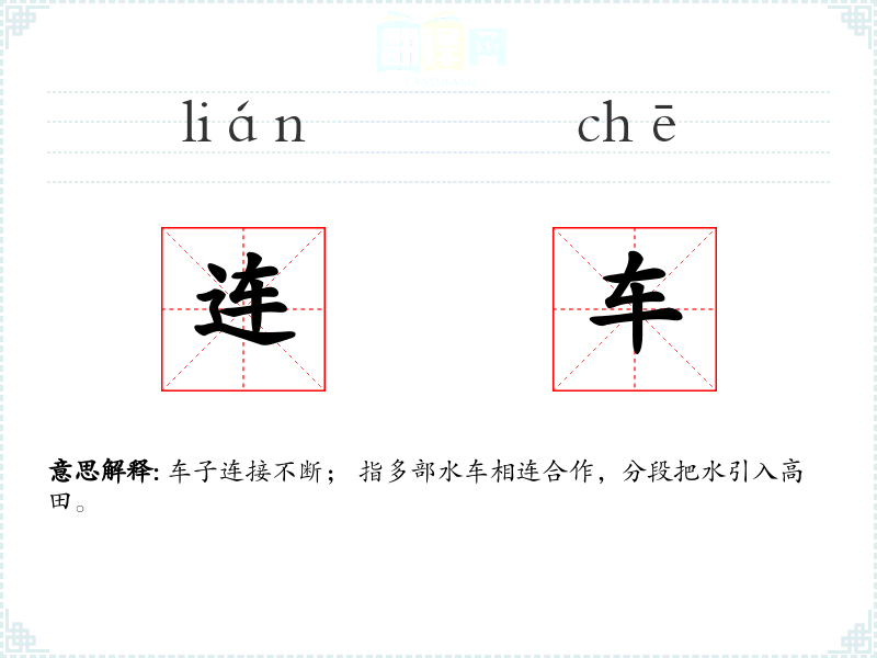 车子连接不断; 指多部水车相连合作,分段把水引入高田。