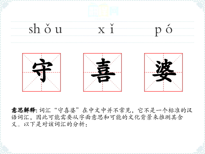 词汇“守喜婆”在中文中并不常见,它不是一个标准的汉语词汇,因此可能需要从字面意思和可能的文化背景来推测其含义。以下是对该词汇的分析: