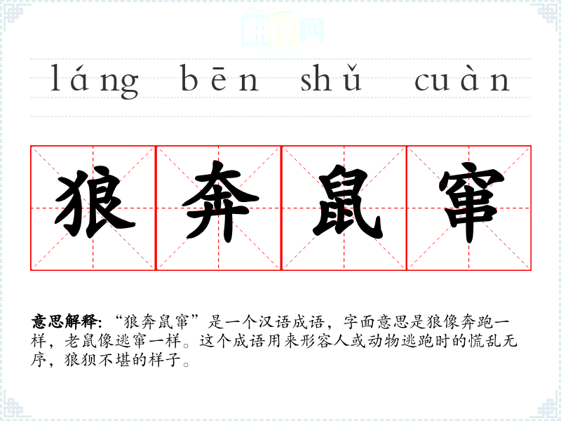 “狼奔鼠窜”是一个汉语成语,字面意思是狼像奔跑一样,老鼠像逃窜一样。这个成语用来形容人或动物逃跑时的慌乱无序,狼狈不堪的样子。