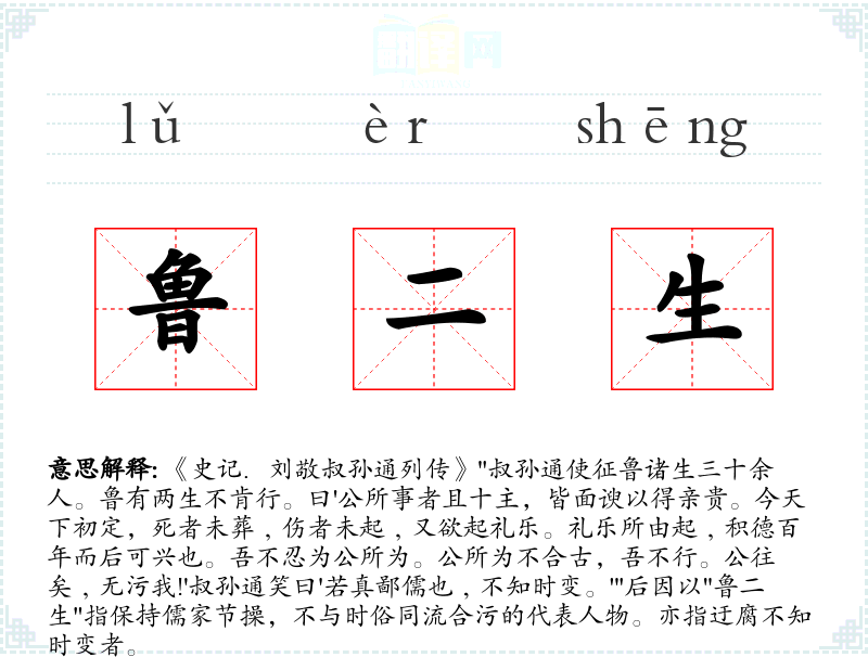 1.《史记.刘敬叔孙通列传》"叔孙通使征鲁诸生三十余人。鲁有两生不肯行。曰'公所事者且十主,皆面谀以得亲贵。今天下初定,死者未葬﹐伤者未起﹐又欲起礼乐。礼乐所由起﹐积德百年而后可兴也。吾不忍为公所为。公所为不合古,吾不行。公往矣﹐无污我!'叔孙通笑曰'若真鄙儒也﹐不知时变。'"后因以"鲁二生"指保持儒家节操,不与时俗同流合污的代表人物。亦指迂腐不知时变者。