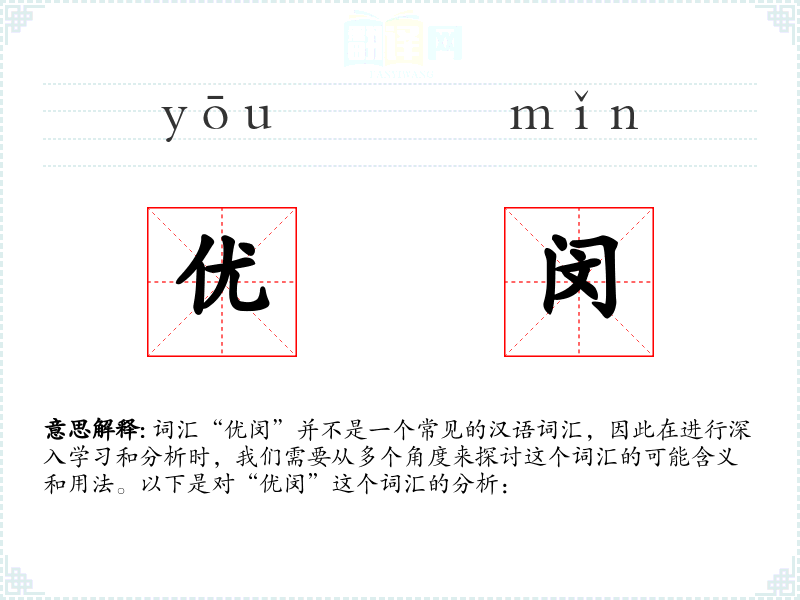 词汇“优闵”并不是一个常见的汉语词汇,因此在进行深入学习和分析时,我们需要从多个角度来探讨这个词汇的可能含义和用法。以下是对“优闵”这个词汇的分析: