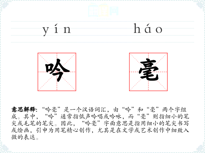 在文学语境中,“吟毫”常用来形容诗人或文人用笔精心创作诗歌或文章,强调其创作过程中的细腻和用心。在口语中,这个词可能不太常用,但在艺术和文学专业领域,它是一个较为专业的术语。