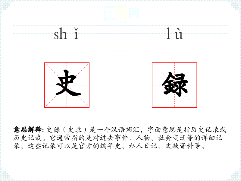 史録(史录)是一个汉语词汇,字面意思是指历史记录或历史记载。它通常指的是对过去**、人物、社会变迁等的详细记录,这些记录可以是官方的编年史、私人日记、文献资料等。