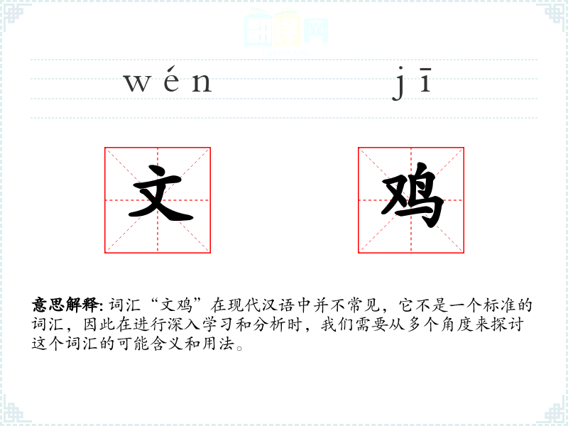 “文鸡”字面意思可能是指“文化的鸡”或“文雅的鸡”。然而,由于这个词汇不常见,它的确切含义可能需要根据具体的语境来确定。
