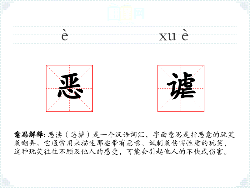 恶渎(恶谑)是一个汉语词汇,字面意思是指恶意的玩笑或嘲弄。它通常用来描述那些带有恶意、讽刺或伤害性质的玩笑,这种玩笑往往不顾及他人的感受,可能会引起他人的不快或伤害。
