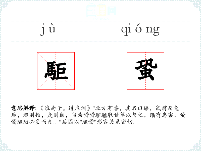 《淮南子。道应训》"北方有兽,其名曰躡,鼠前而兔后,趋则顿,走则颠,当为蛩蛩駏驉取甘草以与之,躡有患害,蛩蛩駏驉必负而走。"后因以"駏蛩"形容关系密切。