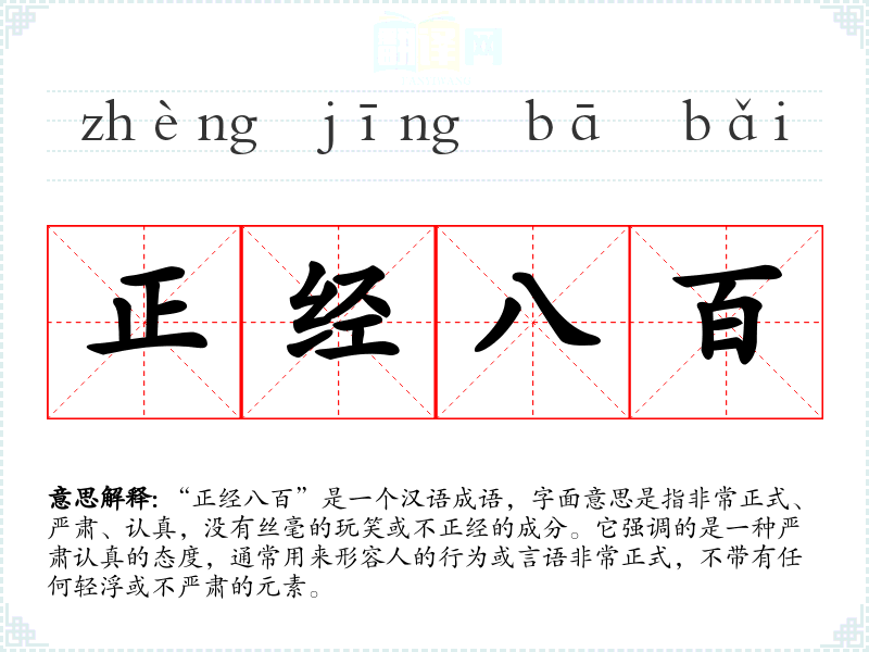 “正经八百”是一个汉语成语,字面意思是指非常正式、严肃、认真,没有丝毫的玩笑或不正经的成分。它强调的是一种严肃认真的态度,通常用来形容人的行为或言语非常正式,不带有任何轻浮或不严肃的元素。