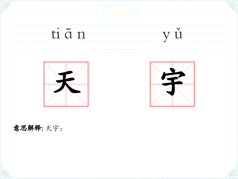- 字面意思:“天”指天空,“宇”指宇宙。