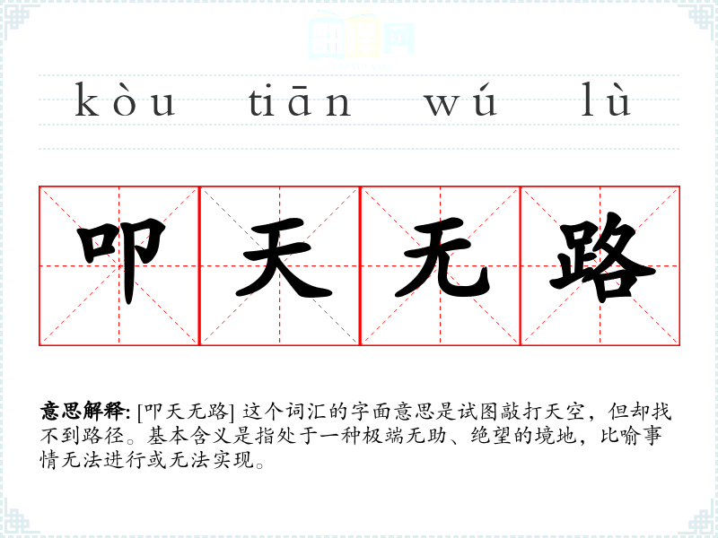 [叩天无路] 这个词汇的字面意思是试图敲打天空,但却找不到路径。基本含义是指处于一种极端无助、绝望的境地,比喻事情无法进行或无法实现。