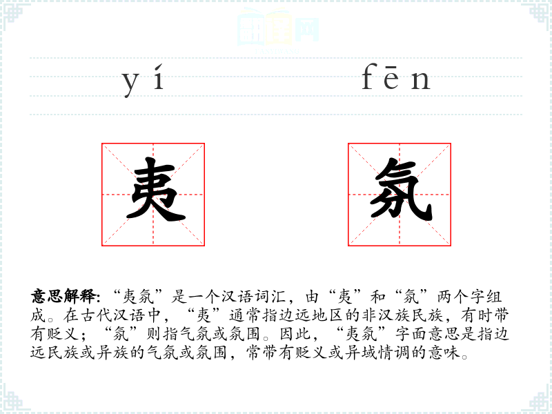 “夷氛”是一个汉语词汇,由“夷”和“氛”两个字组成。在古代汉语中,“夷”通常指边远地区的非**民族,有时带有贬义;“氛”则指气氛或氛围。因此,“夷氛”字面意思是指边远民族或异族的气氛或氛围,常带有贬义或异域情调的意味。