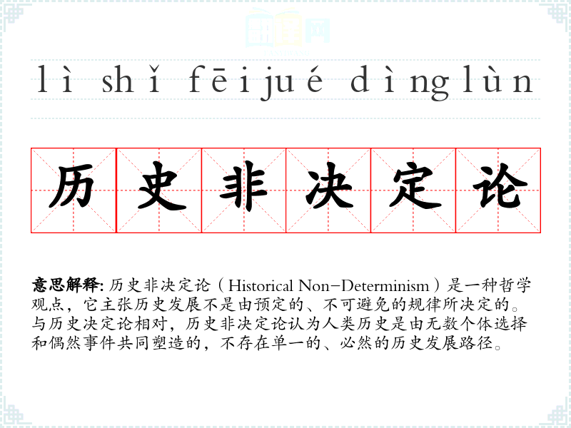 同义词:历史多元论(Historical Pluralism)、历史偶然论(Historical Contingency) 反义词:历史决定论(Historical Determinism)、历史必然论(Historical Necessitarianism)