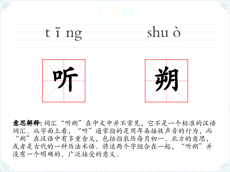 同义词与反义词: 由于“听朔”不是一个常用词汇,很难找到直接的同义词或反义词。如果将其拆分为“听”和“朔”,可以找到一些相关的词汇,如“聆听”(听的同义词)和“望朔”(指观察新月,与“朔”相关)。