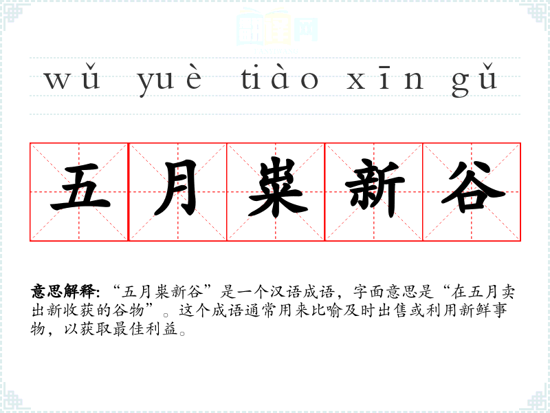 “五月粜新谷”是一个汉语成语,字面意思是“在五月卖出新收获的谷物”。这个成语通常用来比喻及时出售或利用新鲜事物,以获取最佳利益。