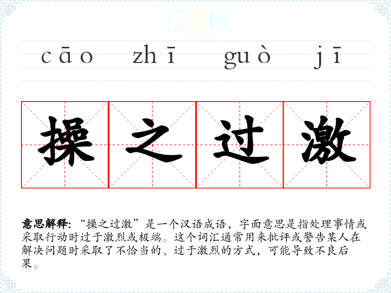 “操之过激”是一个汉语成语,字面意思是指处理事情或采取行动时过于激烈或极端。这个词汇通常用来批评或警告某人在解决问题时采取了不恰当的、过于激烈的方式,可能导致不良后果。