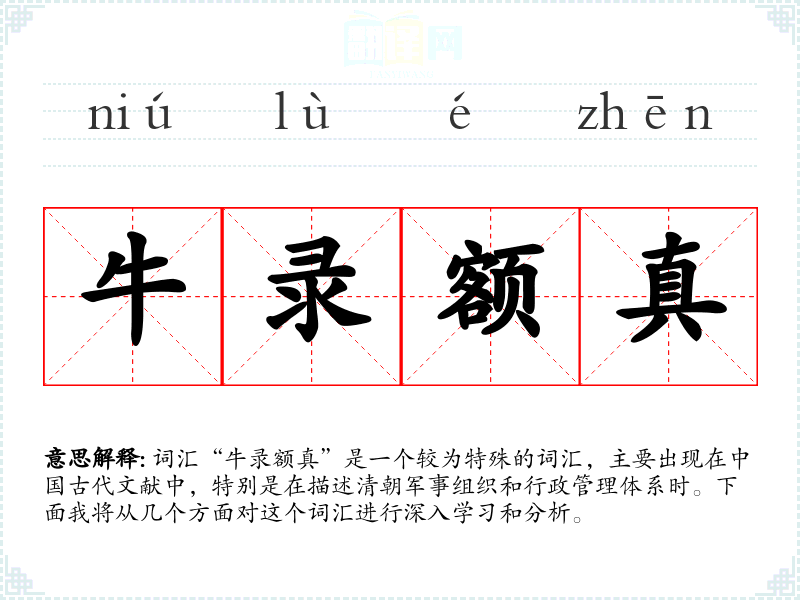 词汇“牛录额真”是一个较为特殊的词汇,主要出现在*古代文献中,特别是在描述清朝军事组织和行政管理体系时。下面我将从几个方面对这个词汇进行深入学和分析。