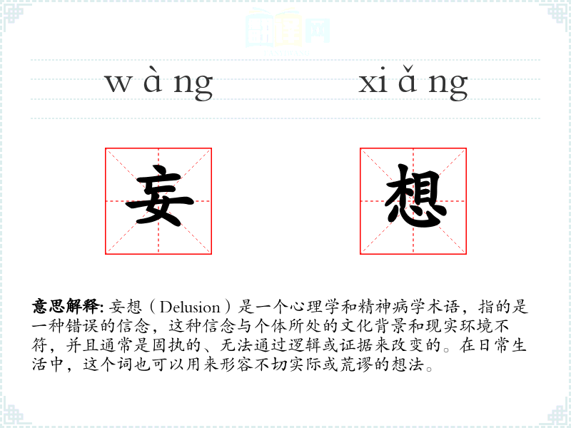 “妄想”一词源自汉语,由“妄”和“想”两个字组成。在古代汉语中,“妄”意味着不真实或不正当,而“想”则是思考或想象的意思。随着时间的推移,这个词被用来描述那些不基于现实的思考。