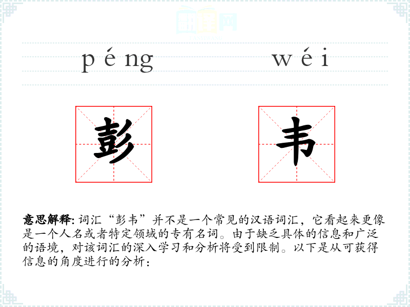 由于“彭韦”不是一个标准词汇,无法给出确切的基本定义。它可能是一个姓氏组合,如“彭”和“韦”都是中文姓氏。
