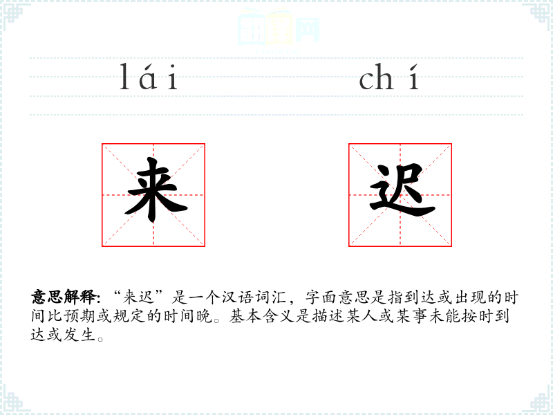 “来迟”由“来”和“迟”两个字组成,其中“来”表示到达,“迟”表示晚。这个词汇在汉语中历史悠久,基本含义没有太大变化。