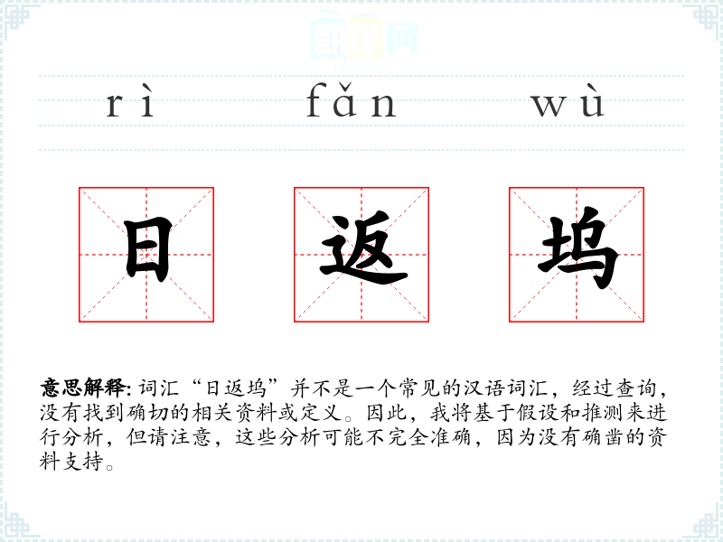 词汇“日返坞”并不是一个常见的汉语词汇,经过查询,没有找到确切的相关资料或定义。因此,我将基于假设和推测来进行分析,但请注意,这些分析可能不完全准确,因为没有确凿的资料支持。