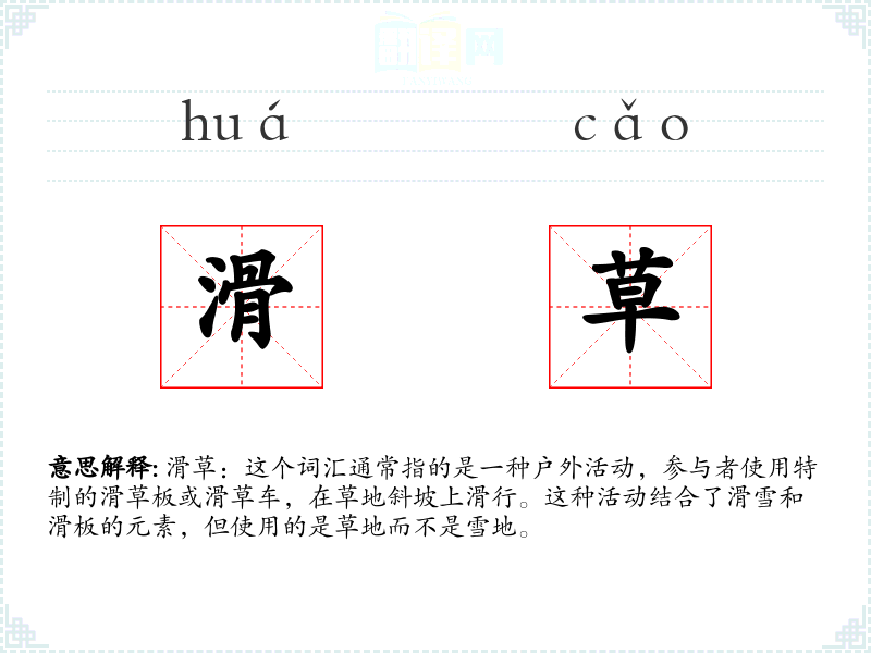 滑草:这个词汇通常指的是一种户外活动,参与者使用特制的滑草板或滑草车,在草地斜坡上滑行。这种活动结合了滑雪和滑板的元素,但使用的是草地而不是雪地。
