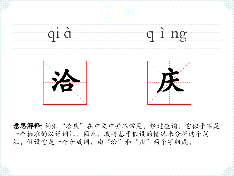 词汇“洽庆”在中文中并不常见,经过查询,它似乎不是一个标准的汉语词汇。因此,我将基于假设的情况来分析这个词汇,假设它是一个合成词,由“洽”和“庆”两个字组成。