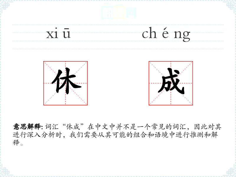由于“休成”不是一个常见词汇,它在不同语言或文化中的对应词汇可能不太明显。在其他语言中,可能需要找到类似的表达,如“rest and achieve”或“pause and succeed”。