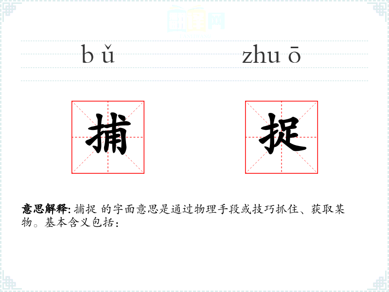 捕捉 的字面意思是通过物理手段或技巧抓住、获取某物。基本含义包括: