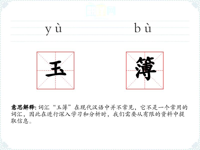 词汇“玉簿”在现代汉语中并不常见,它不是一个常用的词汇,因此在进行深入学*和分析时,我们需要从有限的资料中提取信息。