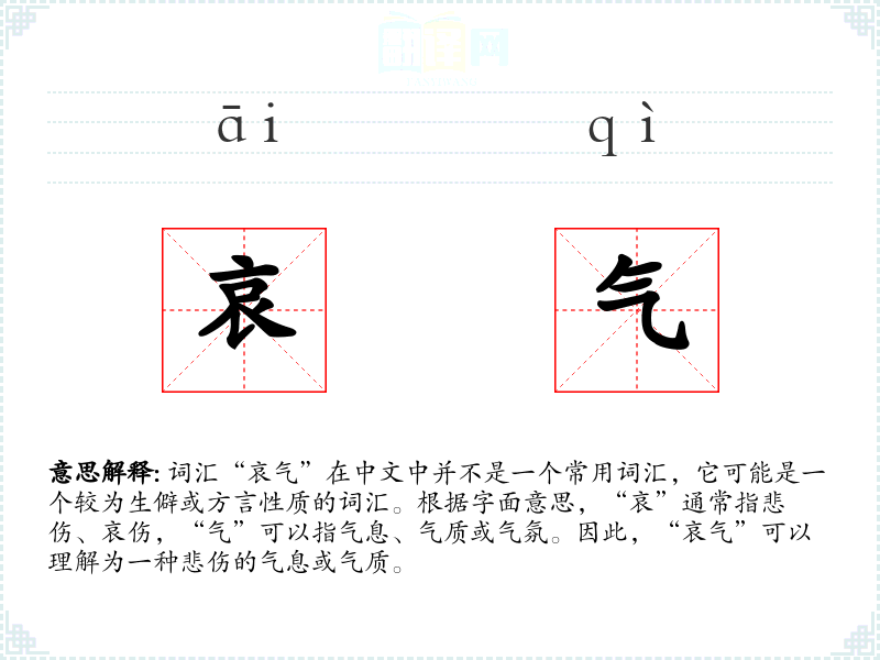 词汇“哀气”在中文中并不是一个常用词汇,它可能是一个较为生僻或方言性质的词汇。根据字面意思,“哀”通常指悲伤、哀伤,“气”可以指气息、气质或气氛。因此,“哀气”可以理解为一种悲伤的气息或气质。