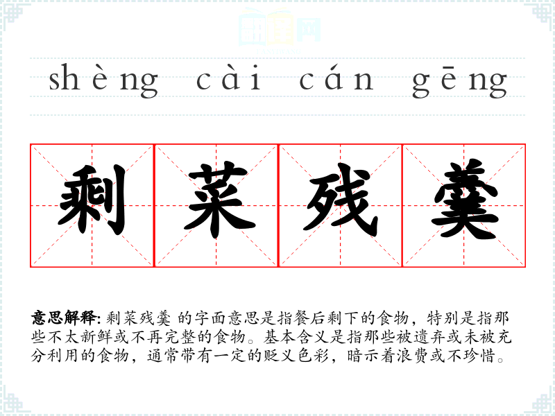 剩菜残羹 的字面意思是指餐后剩下的食物,特别是指那些不太新鲜或不再完整的食物。基本含义是指那些被遗弃或未被充分利用的食物,通常带有一定的贬义色彩,暗示着浪费或不珍惜。