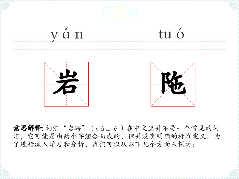 词汇“岩崿”(yán è)在中文里并不是一个常见的词汇,它可能是由两个字组合而成的,但并没有明确的标准定义。为了进行深入学习和分析,我们可以从以下几个方面来探讨: