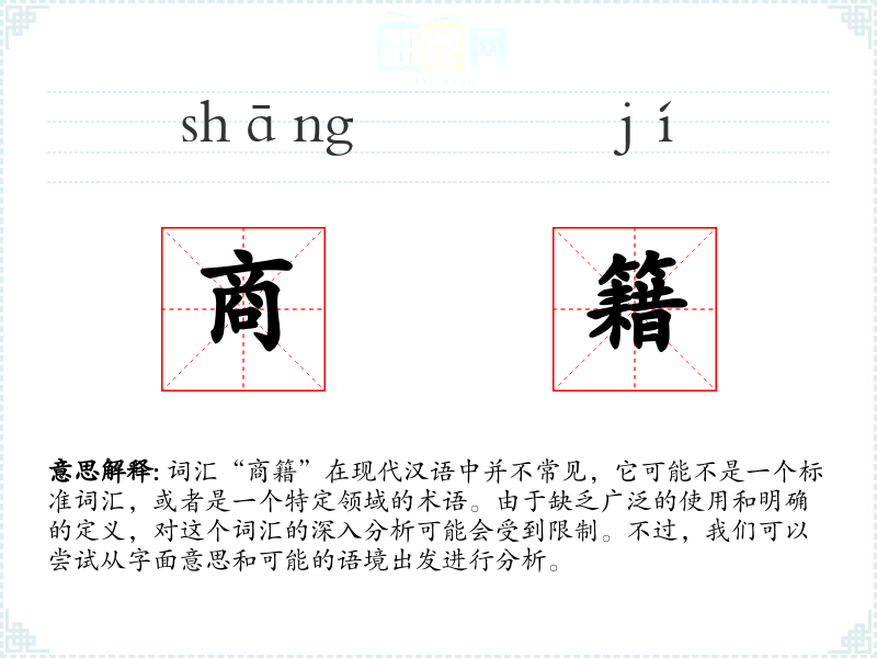 词汇“商籍”在现代汉语中并不常见,它可能不是一个标准词汇,或者是一个特定领域的术语。由于缺乏广泛的使用和明确的定义,对这个词汇的深入分析可能会受到限制。不过,我们可以尝试从字面意思和可能的语境出发进行分析。
