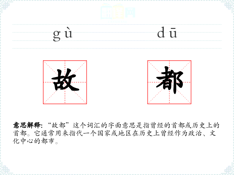 “故都”这个词汇的字面意思是指曾经的首都或历史上的首都。它通常用来指代一个国家或地区在历史上曾经作为政治、文化中心的都市。