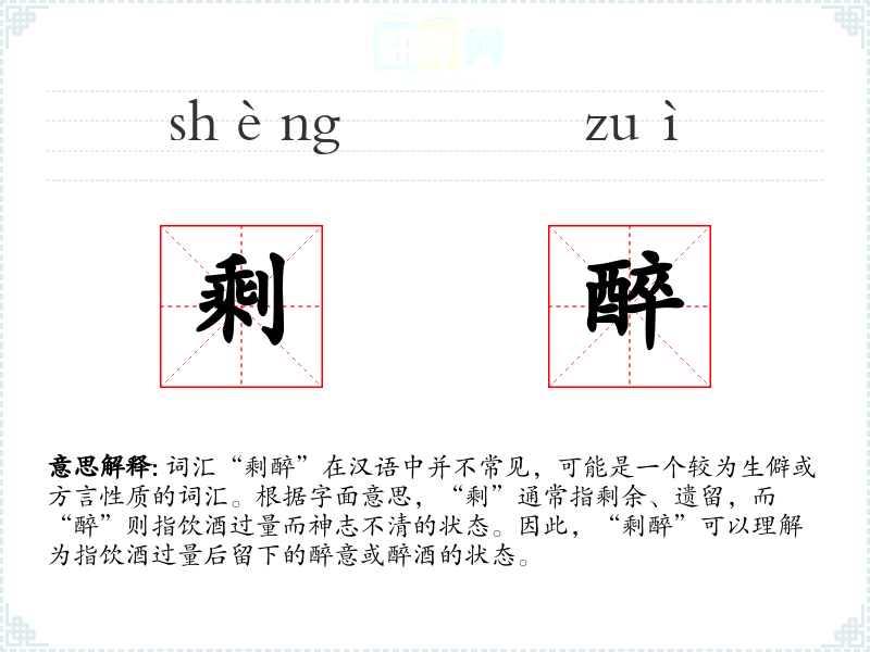 词汇“剩醉”在汉语中并不常见,可能是一个较为生僻或方言性质的词汇。根据字面意思,“剩”通常指剩余、遗留,而“醉”则指饮酒过量而神志不清的状态。因此,“剩醉”可以理解为指饮酒过量后留下的醉意或醉酒的状态。