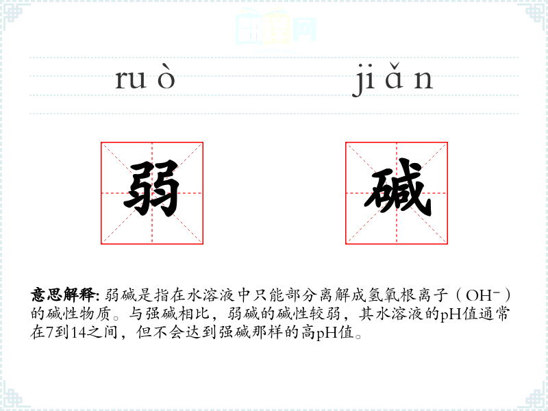 在不同语言中,弱碱的对应词汇可能有所不同,但其基本概念是相通的。例如,在英语中,弱碱可以翻译为“weak base”。