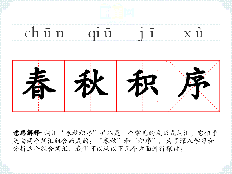 词汇“春秋积序”并不是一个常见的成语或词汇,它似乎是由两个词汇组合而成的:“春秋”和“积序”。为了深入学*和分析这个组合词汇,我们可以从以下几个方面进行探讨:
