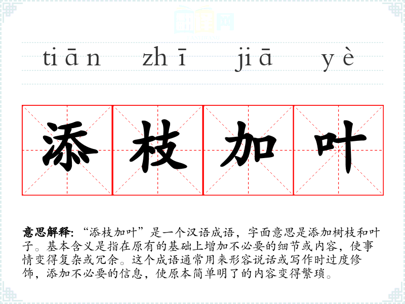 “添枝加叶”是一个汉语成语,字面意思是添加树枝和叶子。基本含义是指在原有的基础上增加不必要的细节或内容,使事情变得复杂或冗余。这个成语通常用来形容说话或写作时过度修饰,添加不必要的信息,使原本简单明了的内容变得繁琐。