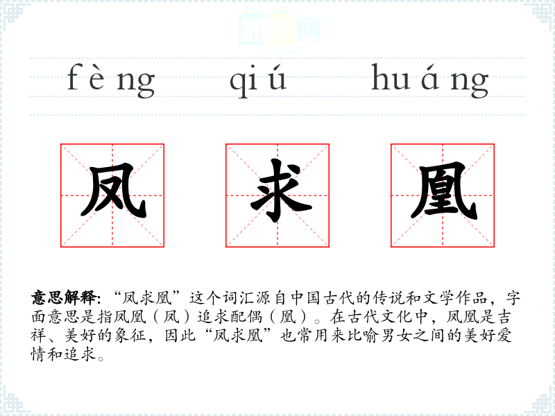 “凤求凰”这个词汇源自**古代的传说和文学作品,字面意思是指凤凰(凤)追求配偶(凰)。在古代文化中,凤凰是吉祥、美好的象征,因此“凤求凰”也常用来比喻男女之间的美好爱情和追求。