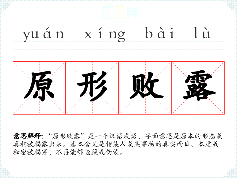 “原形败露”是一个汉语成语,字面意思是原本的形态或真相被揭露出来。基本含义是指某人或某事物的真实面目、本质或秘密被揭穿,不再能够隐藏或伪装。