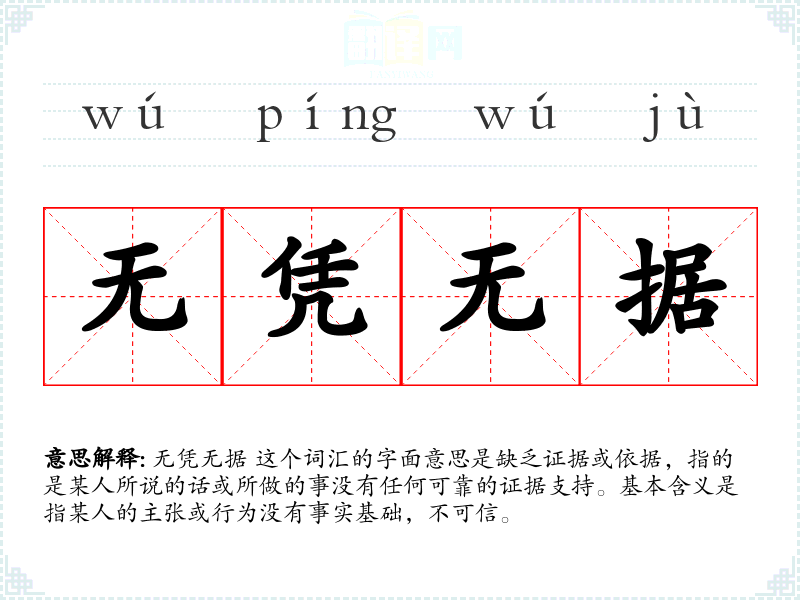 无凭无据 这个词汇的字面意思是缺乏证据或依据,指的是某人所说的话或所做的事没有任何可靠的证据支持。基本含义是指某人的主张或行为没有事实基础,不可信。