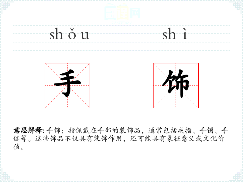 手饰:指佩戴在手部的装饰品,通常包括戒指、手镯、手链等。这些饰品不仅具有装饰作用,还可能具有象征意义或文化价值。