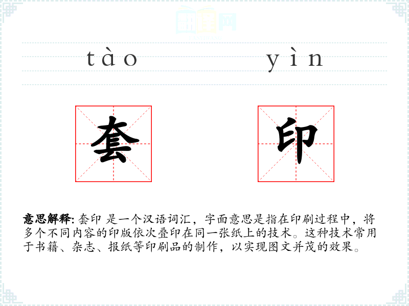 套印 是一个汉语词汇,字面意思是指在印刷过程中,将多个不同内容的印版依次叠印在同一张纸上的技术。这种技术常用于书籍、杂志、报纸等印刷品的制作,以实现图文并茂的效果。
